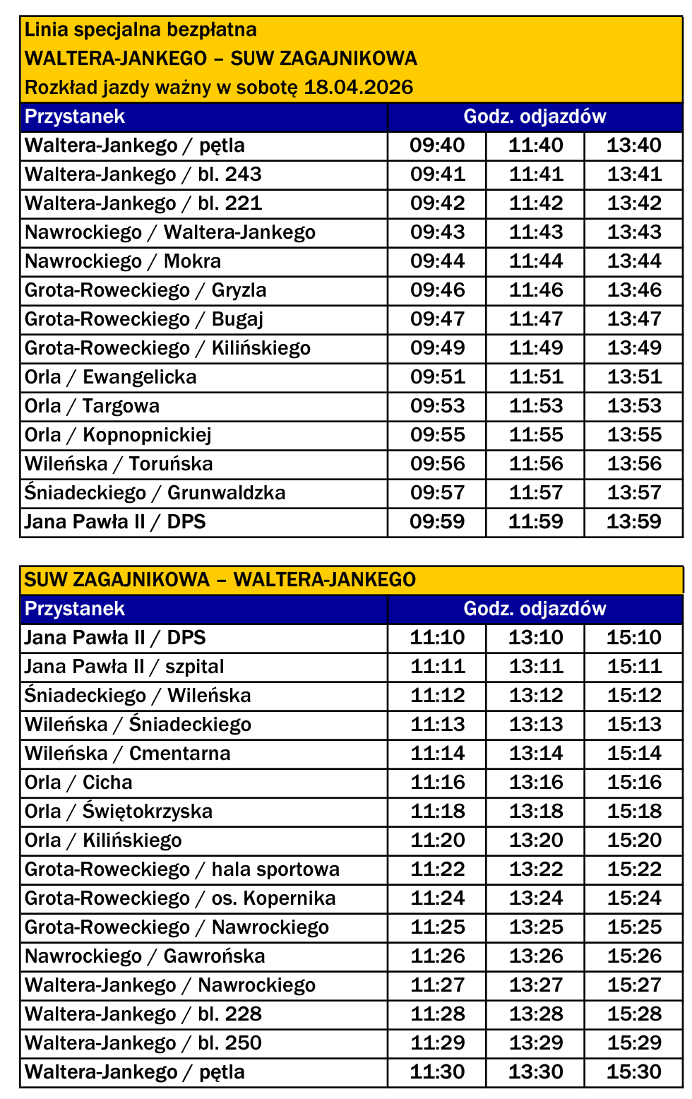 Waltera-Jankego – Nawrockiego – Grota-Roweckiego – Orla – Wileńska – Śniadeckiego – Jana Pawła II – SUW Zagajnikowa